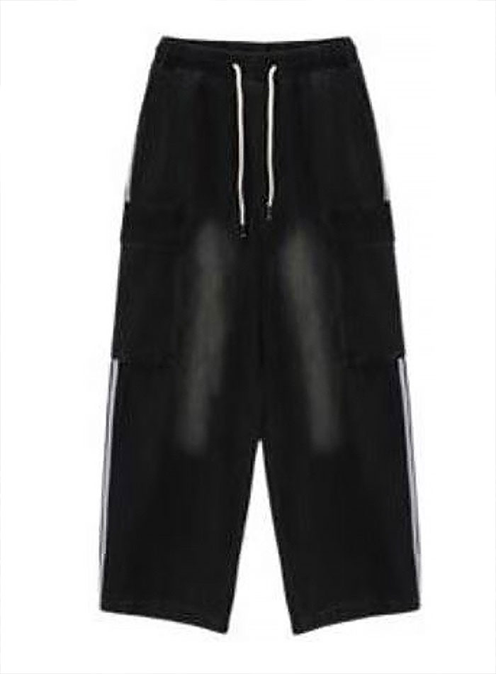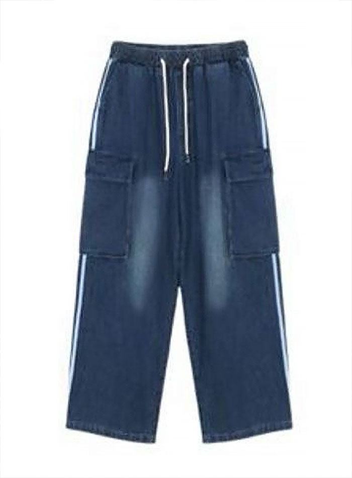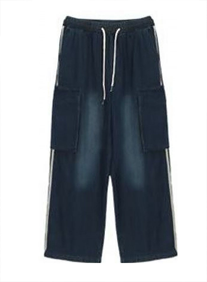 【 Giusto 】兩側3線大口袋鬆緊牛仔寬褲