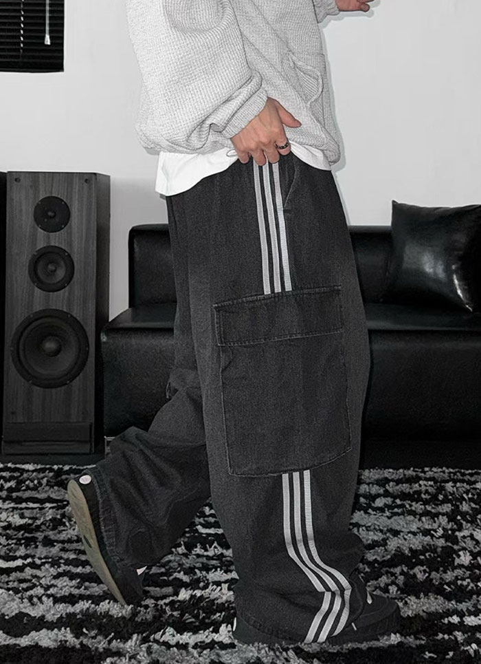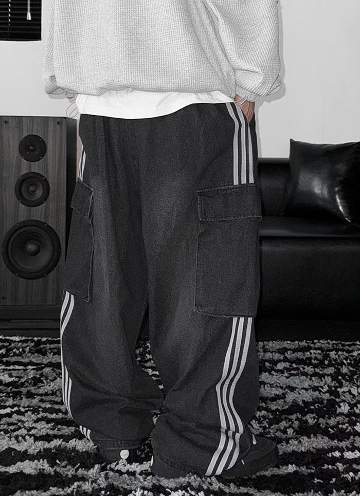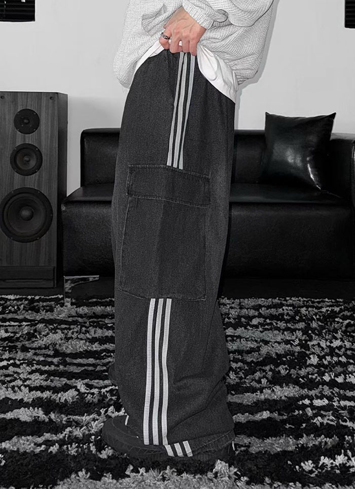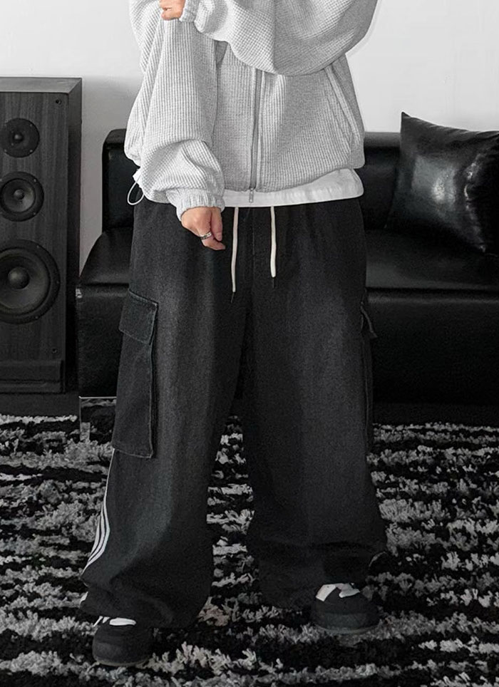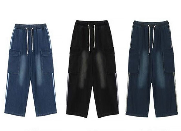 【 Giusto 】兩側3線大口袋鬆緊牛仔寬褲